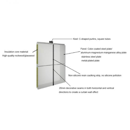 Compuesto por dos láminas metálicas (p. ej., acero galvanizado o aluminio) que encierran un núcleo de lana de roca de alta densidad. Se utiliza poliuretano (PU) para sellar los bordes, creando una estructura compuesta.